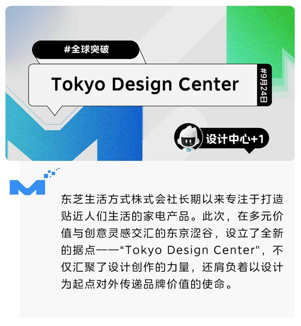 TDC总监宫泽发布了新的东芝品牌生活家电设计理念——“设计以生活为本(Design for Center of Life)”,以品牌宣言“用心致物(Details Matter)”为出发点,聚焦每个人生活中真正重要的事物与体验,并以细致入微的态度融入设计。他介绍,TDC将依托涩谷的创意氛围,开展包括“文化·交流会”“未来生活共创工作坊”等输入活动,以及“涩谷快闪客厅”“家电×艺术装置”等输出活动,以共创为核心推动设计实践。