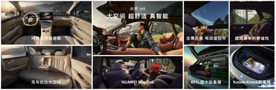 为打造远超同级的舒适,尚界H5以4780mm车长和2840mm轴距打造“三座平权”空间,后排腿部及头部空间均超1米,配备2.3㎡超大穹顶天幕,并通过100+项多级隔振降噪设计等带来超越豪华车的静谧性。储物方面,配备601L后备箱、124L前备箱,增程版、纯电版还分别配有65L、80L储物暗格,支持多元储物,满足全家出行需求。智能方面,鸿蒙座舱支持3D人脸识别、手机无感控车与沉浸式娱乐体验;上市即搭载华为乾崑智驾®ADS 4,并拥有192线激光雷达、4D毫米波雷达等构建起强大的全维感知能力,支持端到端领航辅助、驾驶员失能辅助等多项同级未有的功能。续航方面,增程版综合续航最高达1360km,纯电版综合续航655km。底盘融合上汽70年工程经验与HUAWEI XMOTION Control数字底盘引擎,麋鹿测试成绩78.3kph,百零制动距离34.2m,操控稳定且舒适。此外,新车还拥有远超同级的主被动安全,车辆越级支持eAES增强型紧急转向辅助,拥有超硬核车身、气囊安全、冗余安全等被动安全配置,电池配备高强度底护板、高强度侧边防撞设计等,实现全方位安全防护。
