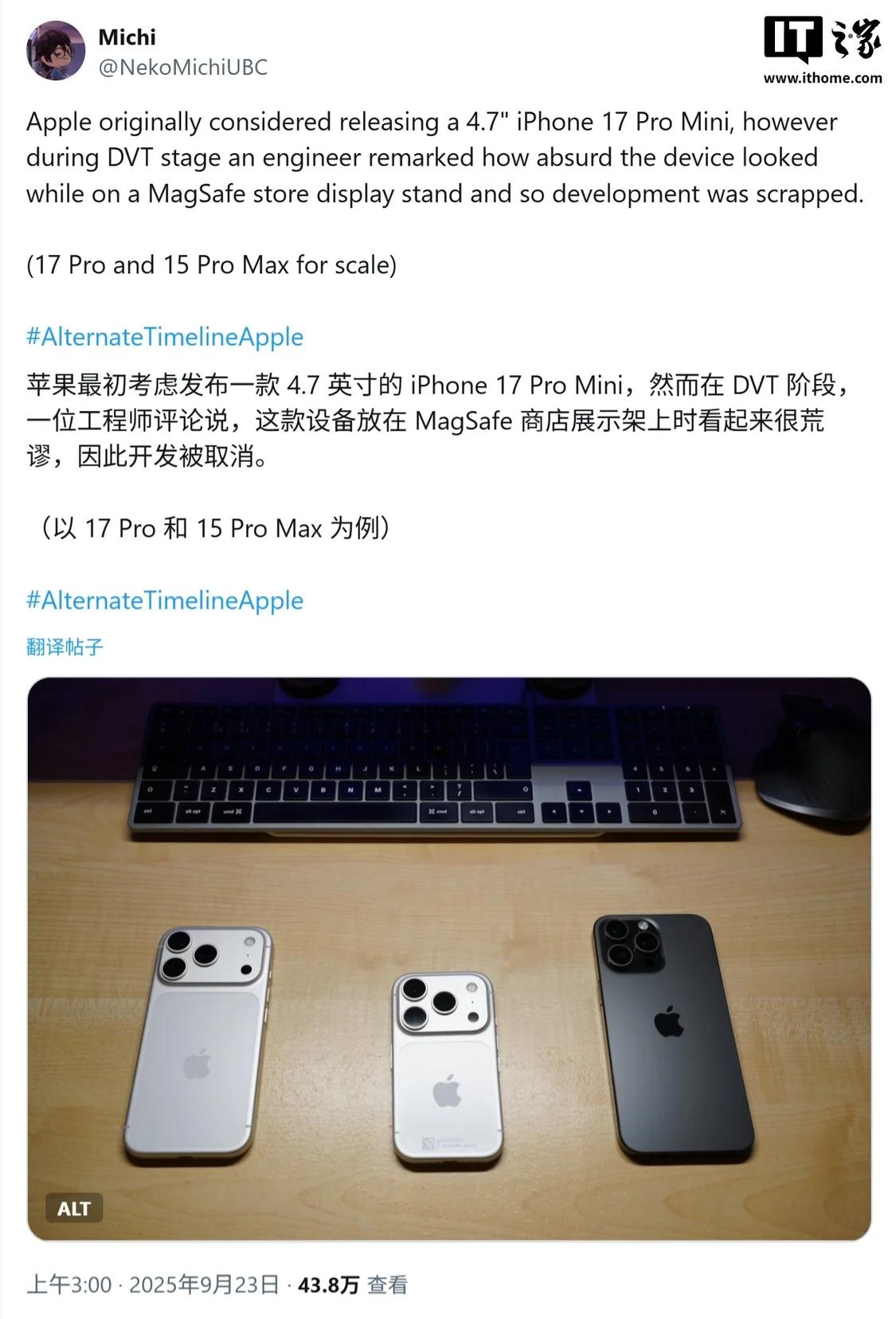 9 月 24 日消息,消息源 @NekoMichiUBC 昨日(9 月 23 日)在 X 平台发布推文,报道称苹果最初考虑发布 4.7 英寸的 iPhone 17 Pro Mini,不过在设计验证测试(DVT)阶段一位工程师认为,这款设备放在 MagSafe 商店展示架上时看起来很荒谬,因此开发被取消。