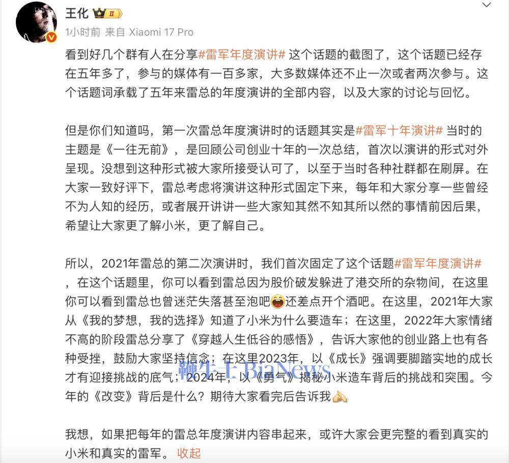 9月24日,小米集团公关部总经理王化发文回应“雷军年度演讲”话题阅读量超116亿。