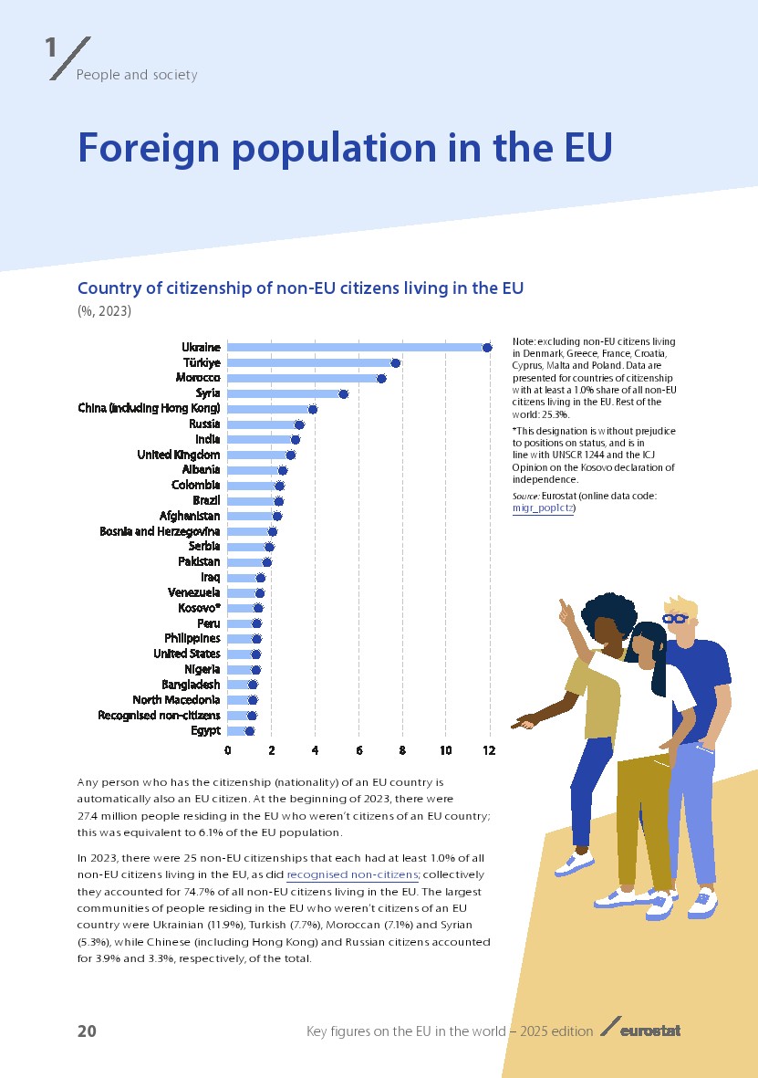 2023年,有25个非欧盟公民群体(含已认可非公民)各占欧盟非欧盟公民总数至少1.0%;合计占74.7%。欧盟境内最大非欧盟公民群体为乌克兰(11.9%)、土耳其(7.7%)、摩洛哥(7.1%)和叙利亚(5.3%),中国(含香港)与俄罗斯公民分别占3.9%和3.3%。