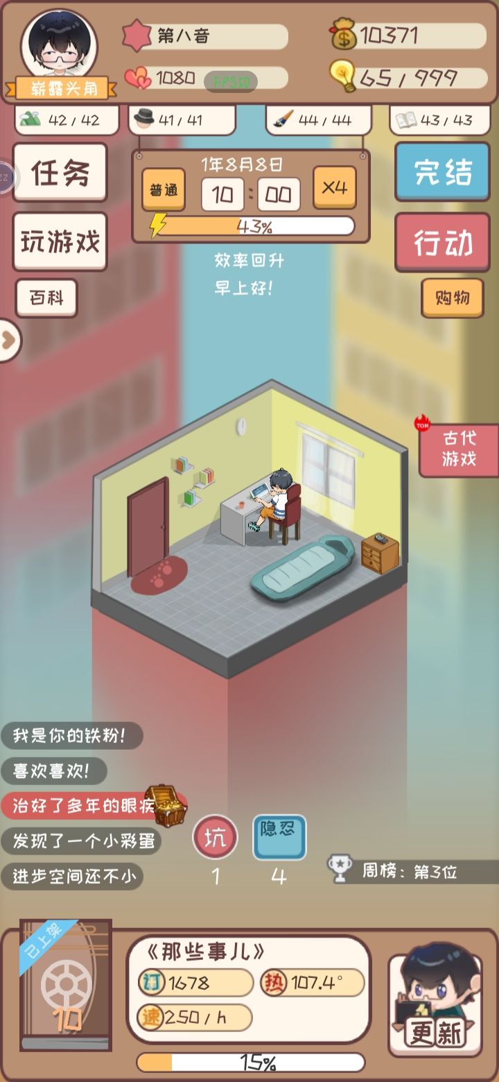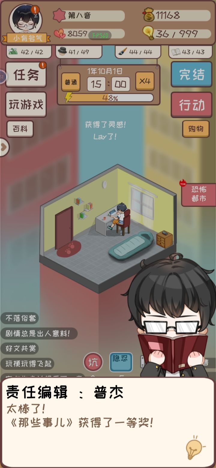 写新书还是老样子,先突突突地快速推进,没灵感就转去摸鱼,这个方法屡试不爽,能迅速起势。中期可以结合转折+突破的低欲策略,适合灵感消耗较大的阶段。灵感充足时可选用红包项,不过打赏金额其实有限。真正能赚到钱的,还是通过摸鱼项接明星稿子,收入至少两三百起步,比较稳定。