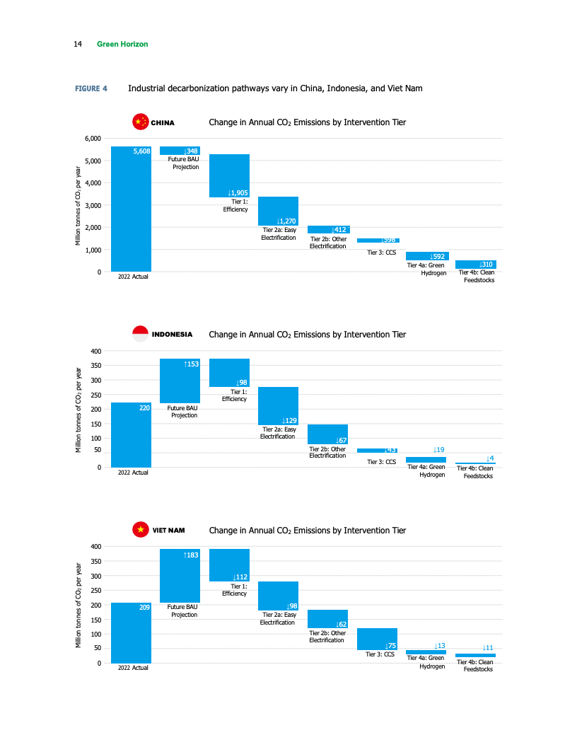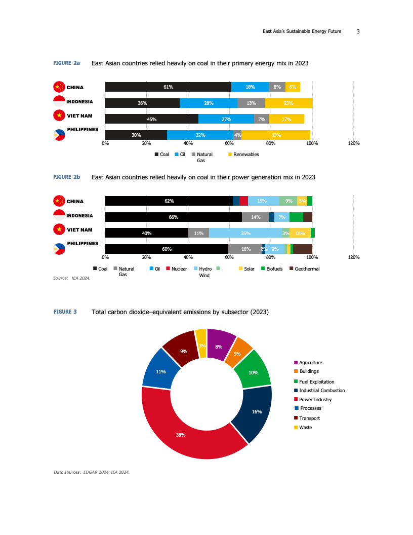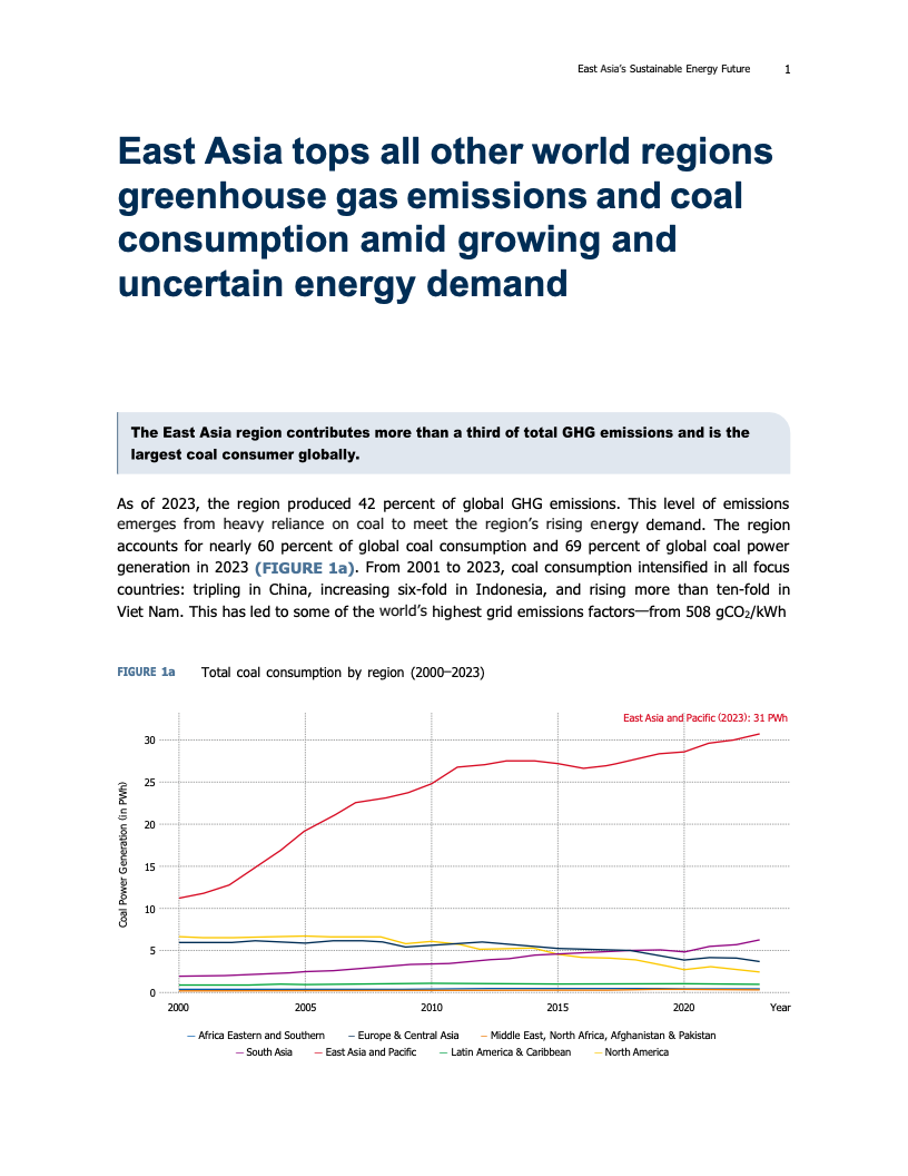 2023年,东亚温室气体排放量占全球42%,煤炭消费量居全球首位。报告重点研究的三个经济体——中国、印度尼西亚和越南,合计贡献区域80%的碳排放量和88%的煤炭消费量,其中电力和工业部门占能源相关排放量的75-87%。