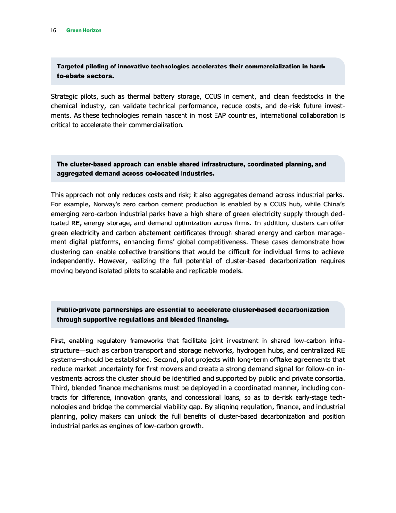 借助竞拍机制与分散式能源部署促进清洁能源发展;推动电网升级,实现波动性绿色能源融合及电气化普及;提高工业能源效率与电气化生产;在减排困难领域投资创新科技,如绿色氢气、碳捕集利用与封存(CCUS);利用混合融资、碳交易及扶持性政策调动民间资金。
