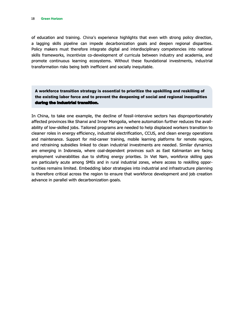 东亚地区的经济转型将助力生产体系升级,增强能源保障,同时在新能源、高端制造及绿色产业等新兴领域开拓就业市场。