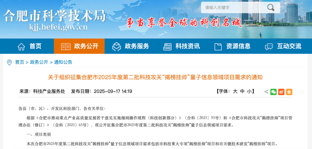 根据《合肥市推动重点产业高质量发展若干意见实施细则操作规程(科技创新部分)》(合科〔2025〕95号)和《合肥市科技攻关“揭榜挂帅”项目管理办法(修订)》(合科〔2025〕65号),现公开征集合肥市2025年度第二批科技攻关“揭榜挂帅”量子信息领域项目需求。