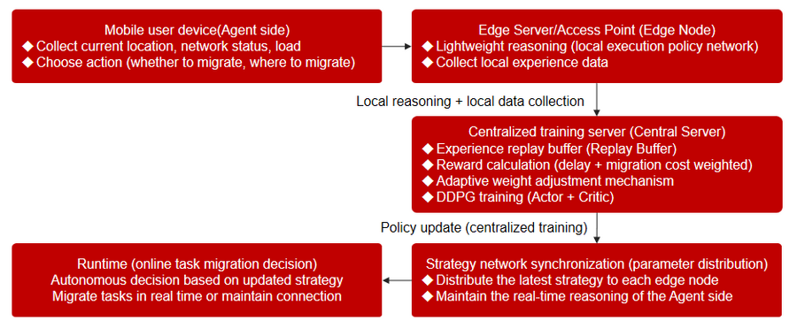 系统架构层面,微算法科技设计了一个高效的数据收集与训练流程。首先,通过在边缘节点部署轻量级代理模块,实时收集用户位置变化、服务器负载、网络延迟等关键信息;其次,将这些信息汇总至中心服务器,通过统一的奖励函数评估迁移决策的好坏,并根据自适应权重机制动态调整奖励结构;然后,利用批量经验回放(experience replay)与目标网络(target network)稳定训练过程,避免了强化学习过程中常见的震荡与发散问题;最后,通过策略网络(Actor)和价值网络(Critic)协同优化,实现对复杂环境下任务迁移策略的持续演进。