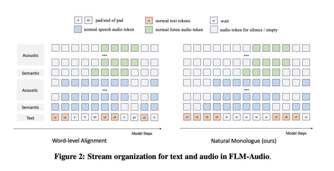 相反,原生全双工(Native Full-Duplex )架构(如 Moshi)将多通道信息在每一时间步合并处理,也就是支持 “边听,边想,边说”,不但避免了序列长度爆炸,而且可以将打断响应的延迟降至最低 80ms 级别。然而,当前的原生全双工模型依赖词级对齐策略,需为每个词标注精确的语音时间戳,并将连续的文本 token 打散。该策略不仅成本高昂,还会破坏预训练语言模型的能力,导致指令跟随性能下降。