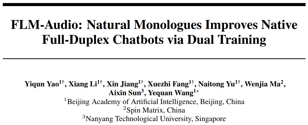 语音交互作为人机通信的关键接口,长期以来受限于高延迟、低自然度的交替式对话架构。为突破这一瓶颈,北京智源人工智能研究院联合 Spin Matrix 与新加坡南洋理工大学,正式发布 RoboBrain-Audio(FLM-Audio) —— 首个支持 “自然独白 + 双训练范式” 的原生全双工语音对话大模型。