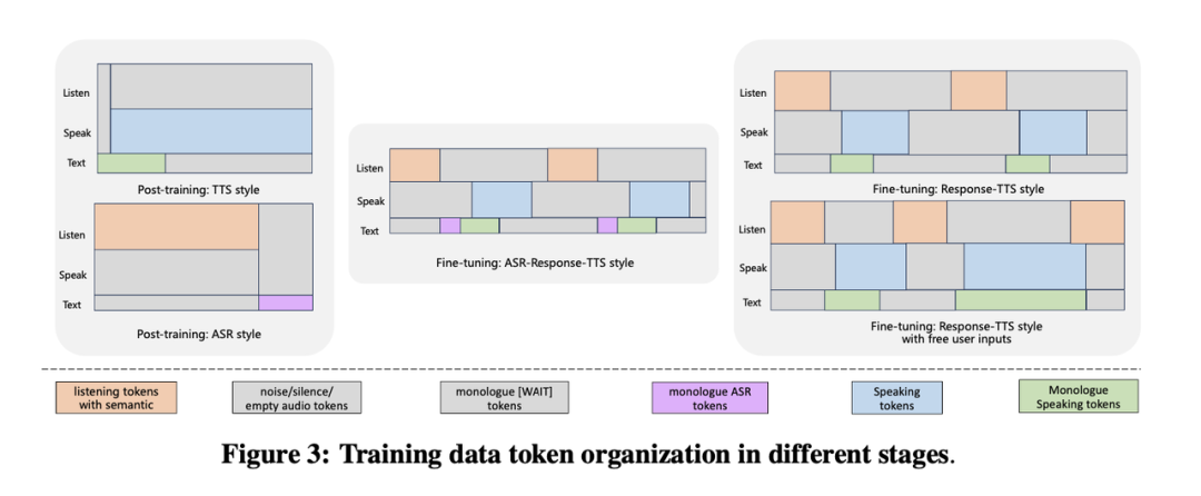 模型训练分为两个阶段,共四个子阶段,分别模拟语音识别(ASR)、语音合成(TTS)及交互对话任务: