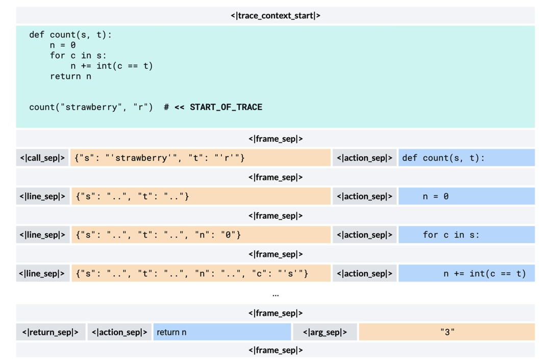 CWM 的 Python 跟踪格式。 在给定源代码上下文与跟踪起始点标记的情况下,CWM 预测一系列的调用栈帧,表示程序状态及相应的执行动作。