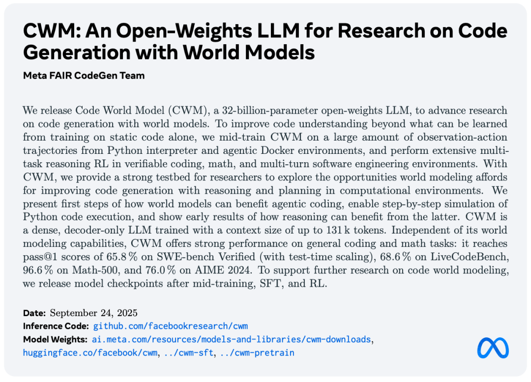 论文链接:https://ai.meta.com/research/publications/cwm-an-open-weights-llm-for-research-on-code-generation-with-world-models/
