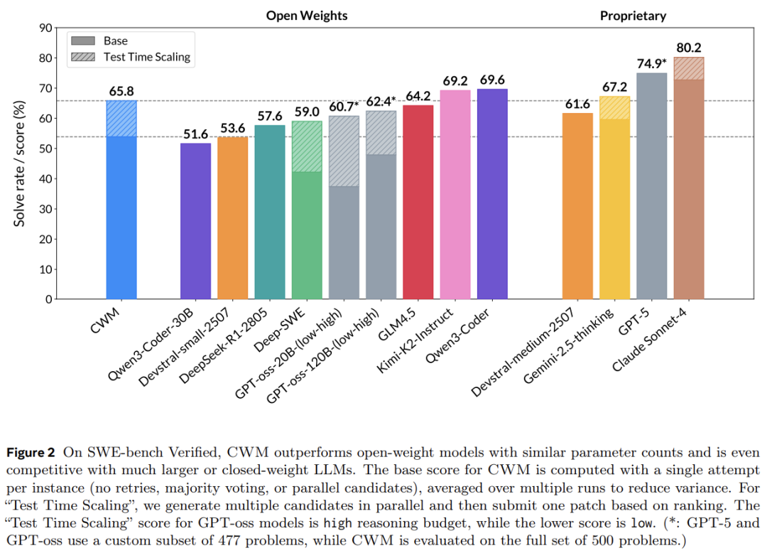 在 Meta 进行的更多实验中,CWM 在有无测试时扩展(tts)的情况下均达到了同类最佳性能,分别取得了 65.8% 和 53.9% 的成绩。需要注意的是,GPT-oss 的分数是基于 500 道题中的 477 道子集计算得出的。