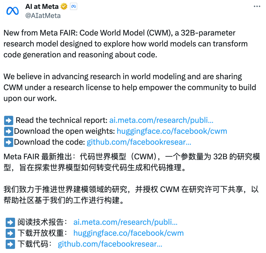 Meta 刚发布的这个 CWM,是一个 320 亿参数的开放权重 LLM,以推动基于世界模型的代码生成研究。