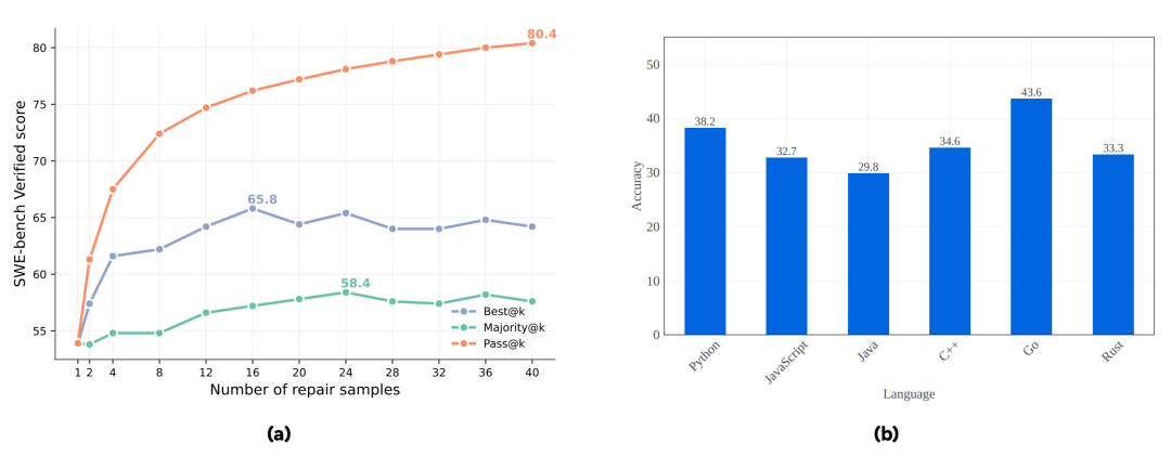 在 SWE-bench Verified 上,结合本文提出的 best@k 方法与多数投票(majority voting)的测试时扩展(TTS),能够显著提升 CWM 的 pass@1 得分,如图(a)所示。