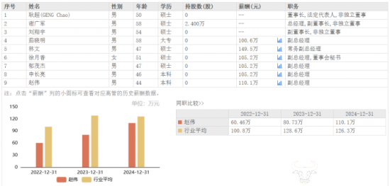 而在去年公司业绩上涨的背景下,公司高管薪酬纷纷增长。赵伟去年薪酬110.1万元,相较于去年同期的80.73万元,增长了29.37万元,为五位副总经理中的最高薪酬,但仍低于常务副总经理林文。林文2024年薪酬为149.5万元,相较于2023年的114.2万元,上涨了35.3万元。