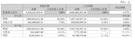 分产品来看,今年上半年,燕京啤酒的核心业务啤酒实现收入78.96亿元,同比增长6.88%,占总营收的92.26%,其中中高档产品实现营收55.36亿元,同比增长9.32%,仍为营收主力,普通产品收入为23.60亿元,同比增长1.56%。
