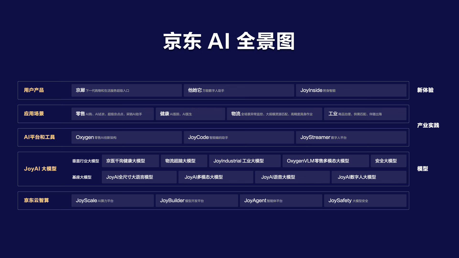 此次大会上,京东围绕全新升级的大模型品牌JoyAI,发布了三大全新AI产品,四大场景深度AI应用以及多个技术平台。