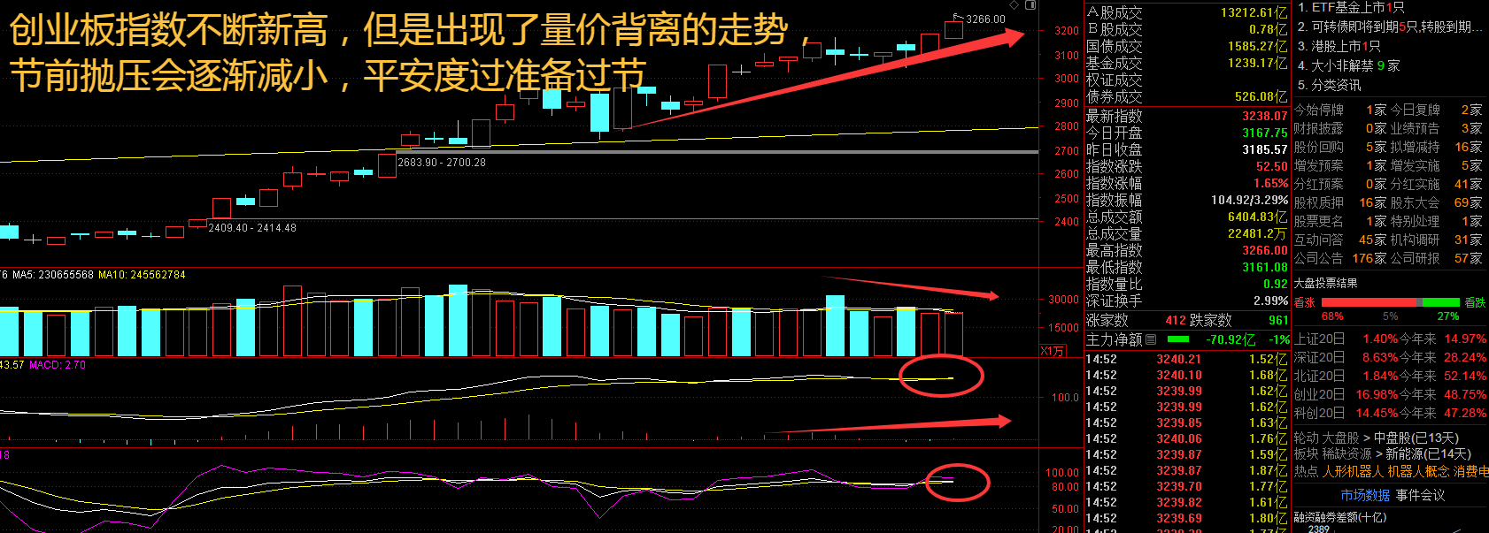创业板指数周四再度新高,这样的盘面给市场信心,但是两市个股上涨力度趋弱,连续大涨的可能性在降低,这里切莫追涨杀跌。聚焦消费潜力释放、有效投资扩大、房地产止跌回稳及改革开放深化,释放稳增长明确信号。8 月 LPR 连续三月持稳,符合市场预期。接下来注意创业板指数能否在3250点之上稳住。