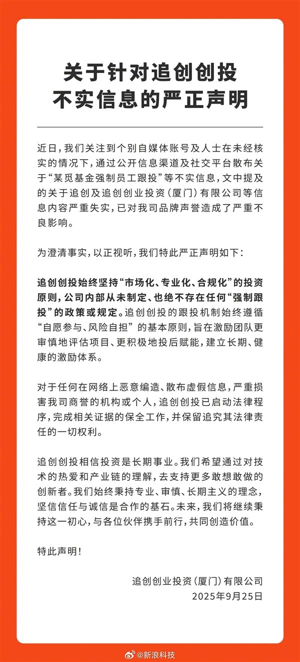 对此,追觅旗下追创创投今日澄清道:公司明确指出,该消息内容失实,追创创投从未制定、也绝不存在任何“强制跟投”的政策或规定。