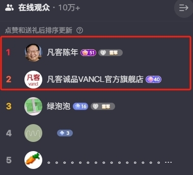 值得注意的是,凡客陈年和凡客官方旗舰店当时在刷礼物的榜单中霸榜前二。