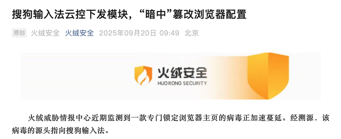 9月20日,火绒安全在微信公众号发布一篇标题为《搜狗输入法云控下发模块,“暗中”篡改浏览器配置》的文章中称,火绒威胁情报中心近期监测到一款专门锁定浏览器主页的病毒正加速蔓延。经溯源,该病毒的源头指向搜狗输入法。