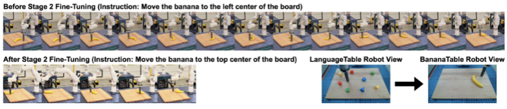 为了进一步探究更强的泛化形式:预训练基础模型的自我提升能否使策略练习并习得超出第一阶段模仿数据集所观察到的全新行为技能。基于真实世界 LanguageTable 数据集训练的策略与奖励模型,在一个名为 “BananaTable” 的新任务上执行自我提升。