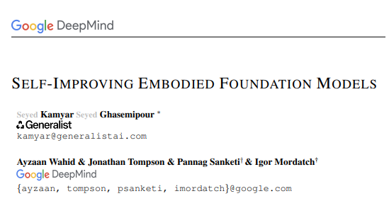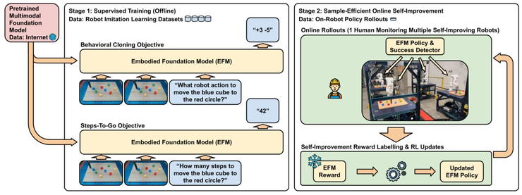 谷歌 DeepMind 的最新研究试图打破这一现状,他们受到大型语言模型微调中强化学习阶段成功经验的启发,提出了一种面向机器人学的两阶段后训练方法,第一阶段是监督微调(Supervised Fine-Tuning, SFT),第二阶段是自我提升(Self-Improvement)。