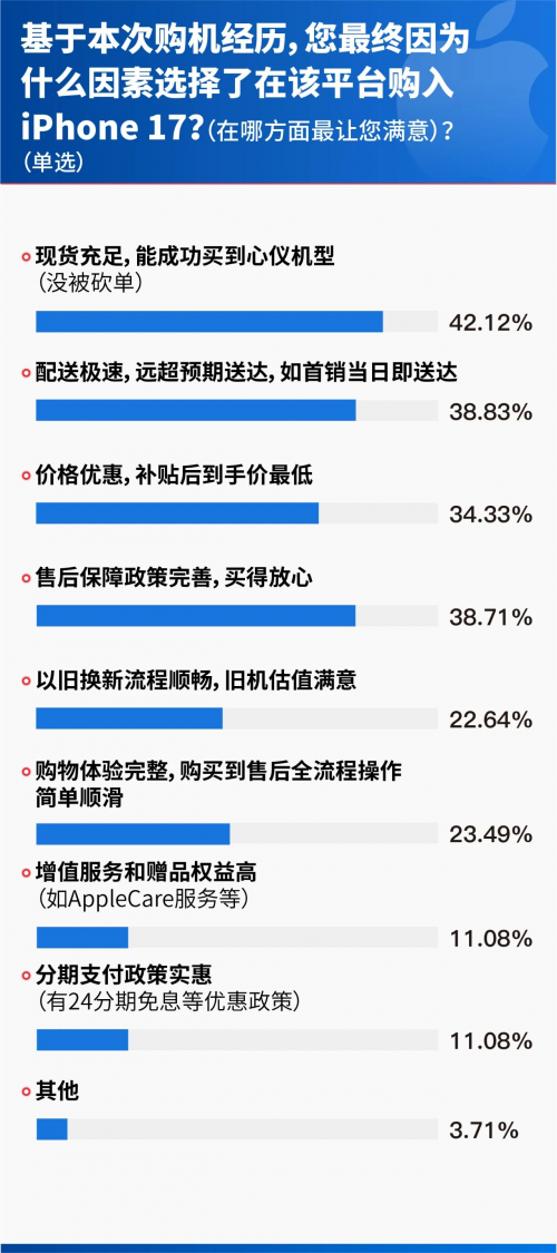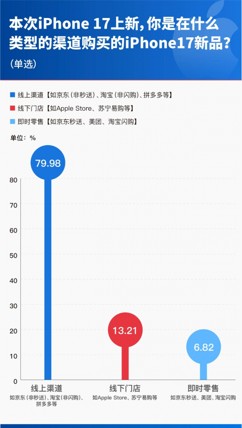 《iPhone17首销调研》调研数据显示,在线上购买iPhone 17系列的用户中,高达72.83%选择京东平台,远超其他渠道。这背后反映了用户对现货保障的强烈需求——首批发售期间,26.86%的用户因“没抢到首批货源”被迫等待,而京东的现货供应能力直接解决了用户的购机焦虑。