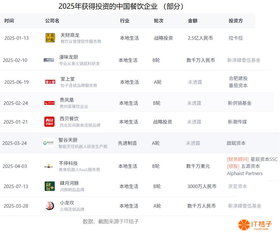 基于IT桔子数据和工商数据的交叉验证,我们选取了以上为2025年获投的餐饮代表企业,他们主要集中于多个细分领域赛道,可以分为智能烹饪机器人、地方特色餐饮、餐饮SAAS、餐饮供应链这四类进行解读说明。