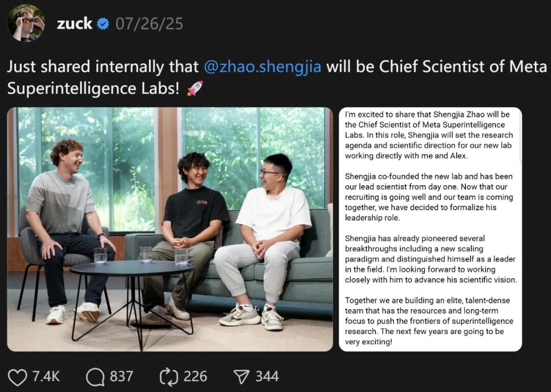 7 月份,扎克伯格在 Threads 的一篇帖子中写道,虽然赵晟佳「是实验室的联合创始人」,并且「从第一天起就是我们的首席科学家」,但 Meta 决定「正式确立他的领导角色」,担任实验室的首席科学家。