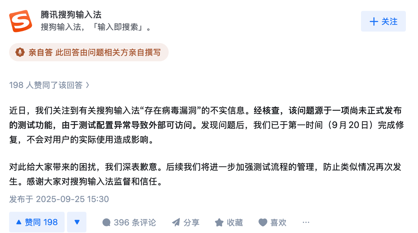 9月25日,“腾讯搜索输入法”知乎账号发文称:近日,我们关注到有关搜狗输入法“存在病毒漏洞”的不实信息。经核查,该问题源于一项尚未正式发布的测试功能,由于测试配置异常导致外部可访问。