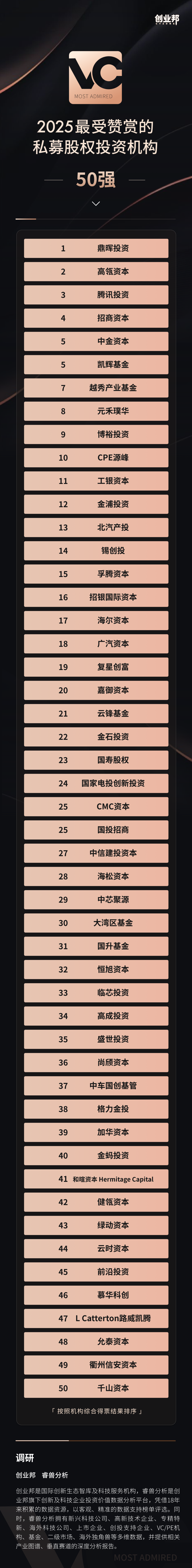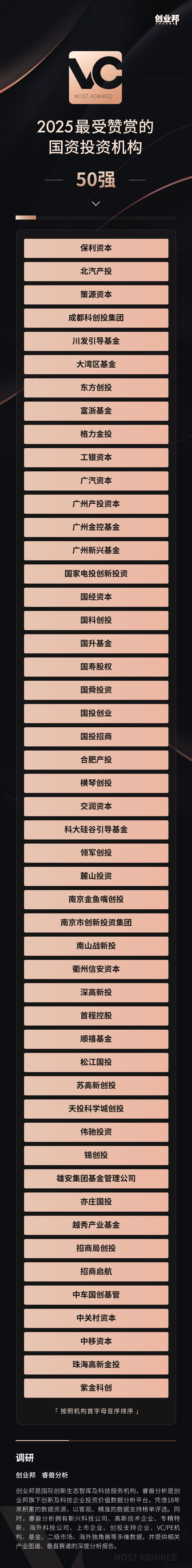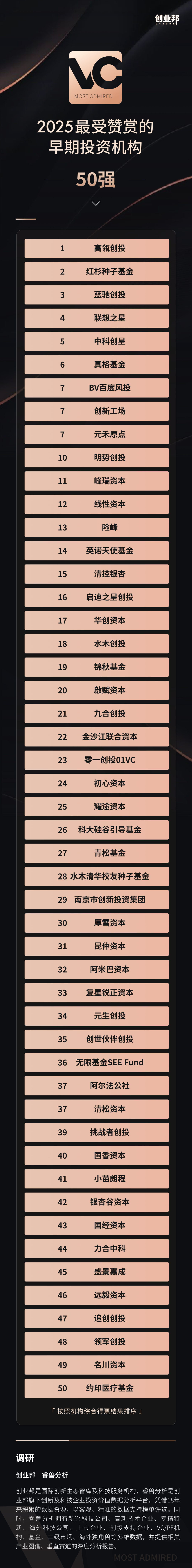结合投资人投票结果与评审规则,我们梳理出2025 年 “最受赞赏的风险投资机构” 完整名录。名录包含 4 大主榜单与 6 大垂直领域榜单: