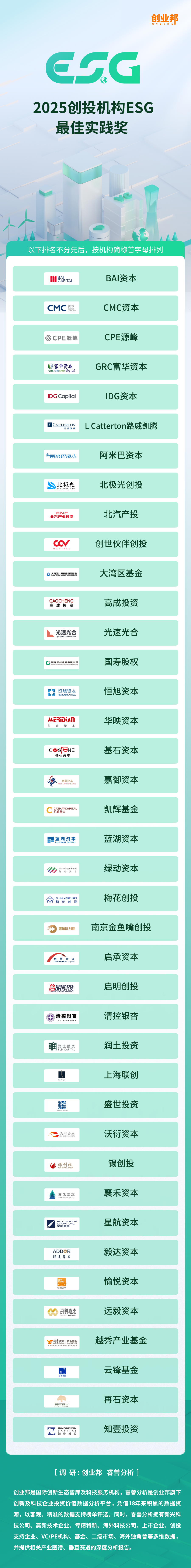 鉴于ESG实践对推动中国创投和创新经济发展的重要意义,今年六月,创业邦连续第四年发起 “创投机构ESG最佳实践奖” 评选活动,历经3个月的报名征集、数据分析和调研等过程,基于严格的标准和严谨的数据,综合衡量机构在制度体系、能力建设、投资流程、遵循国际倡议和透明度等方面的ESG理念实践情况,结合近百家机构申报的问卷数据和部分机构调研信息,最终评选出 “2025创投机构ESG最佳实践奖”,以此表彰创投机构践行ESG投资理念方面取得的显著成果。