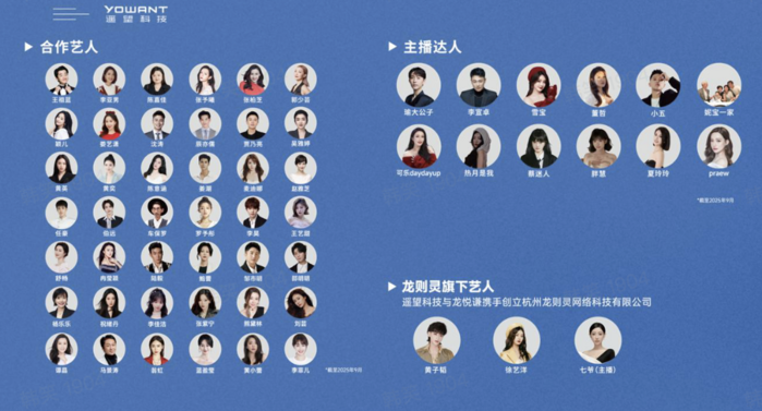 这是我们签约的一些国内的明星也有我们自己培养的达人。目前我们也是整个行业明星最多的机构,我们覆盖的领域也比较多,除了直播、短视频带货、综艺内容,还有线下的演唱会等多元化经营。我们现在用多元化经营的能力,借助自研的AI产品,去赋能所有的业务和工作人员。