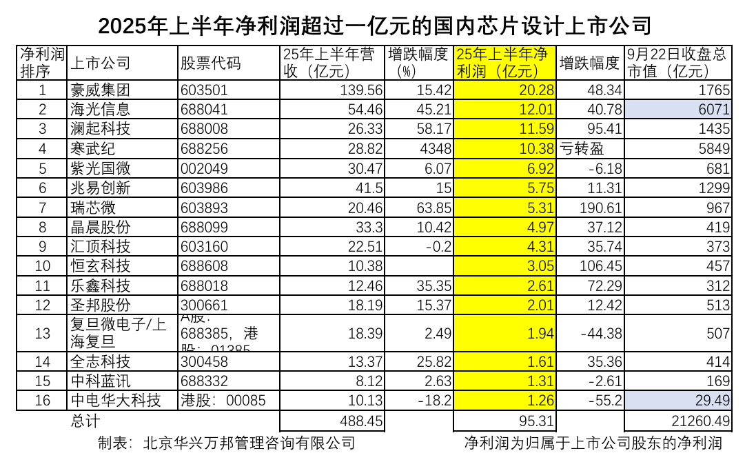 随着8月29日休市后在香港上市的中国电子华大科技有限公司近日公布其2025年中期业绩公告,2025年上半年“归属上市公司股东净利润”超过一亿元的国内芯片设计上市公司基本浮出水面。根据北京华兴万邦管理咨询有限公司的统计,目前共有16家上市芯片设计公司半年净利润过亿,加上还有华为海思半导体、紫光展锐和国网智芯等多家有规模但未上市的芯片设计企业,他们的半年净利润也有可能超过了亿元,所以国内有20家左右芯片设计企业在今年上半年盈利过亿。他们在我国5000多家芯片设计企业中盈利能力排在了前3%,因而其中每一家都值得大家去关注和分析。