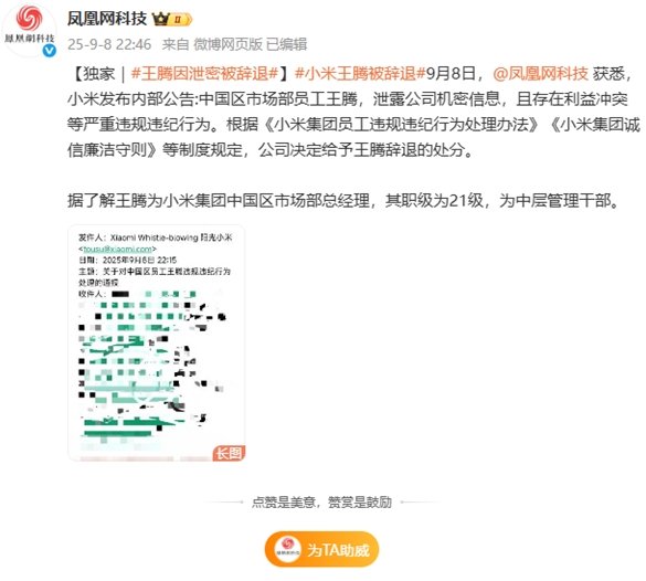 此前在9月8日,原小米中国区市场部总经理、REDMI品牌总经理王腾因泄密被辞退。