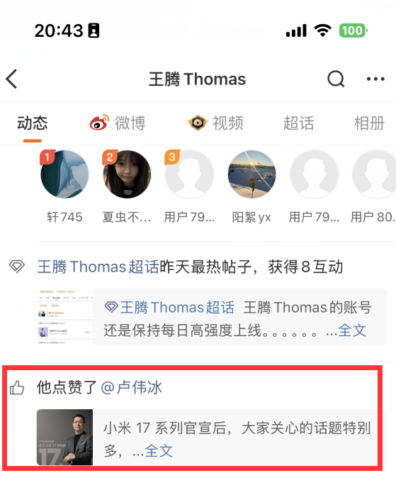 不仅如此,此前他还对小米集团总裁卢伟冰于9月17日发布的一条微博进行了点赞操作。