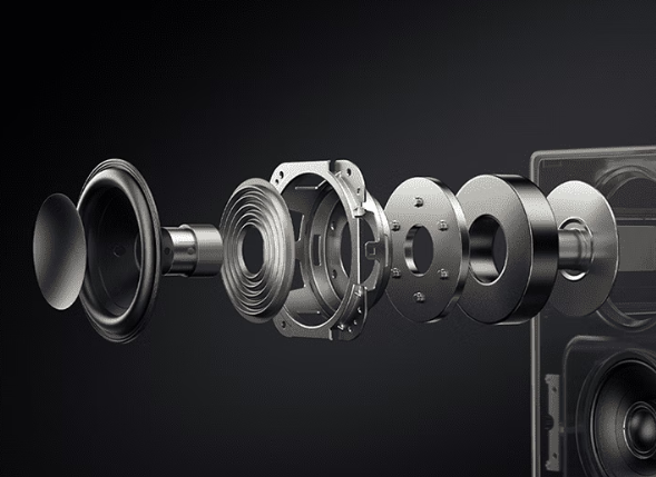 音箱使用三分频对称式架构,使用深度定制喇叭,配备双上下对称布局4英寸30W低音单元和中高频前后同轴单元。