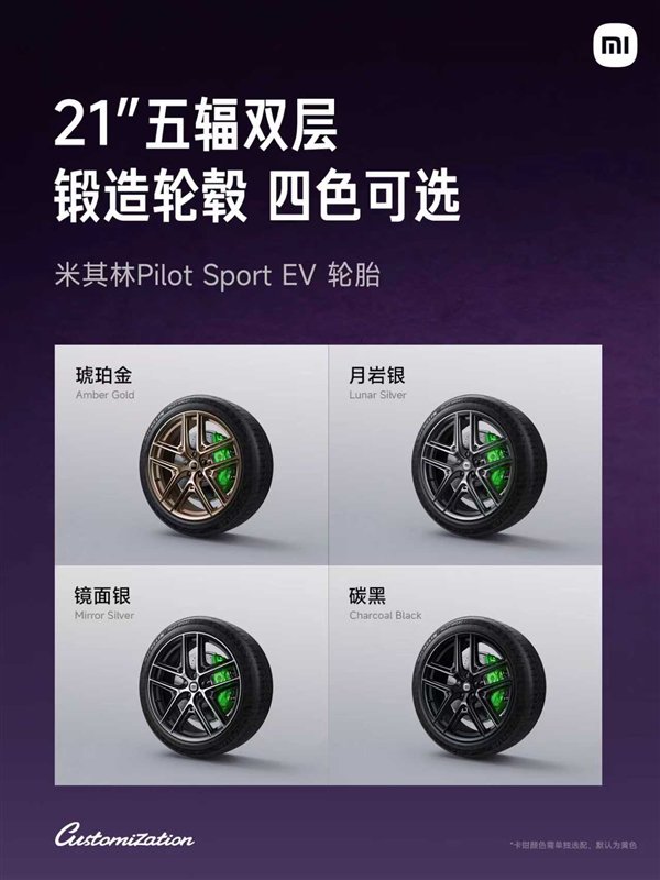 此外,小米定制服务还新增了21英寸的五辐双层锻造轮毂,这个轮毂用20多把刀头铣削,铣削加工耗费将近11个小时,非常精致,一共有 4 种颜色可选,分别为琥珀金、月岩银、镜面银、碳黑。