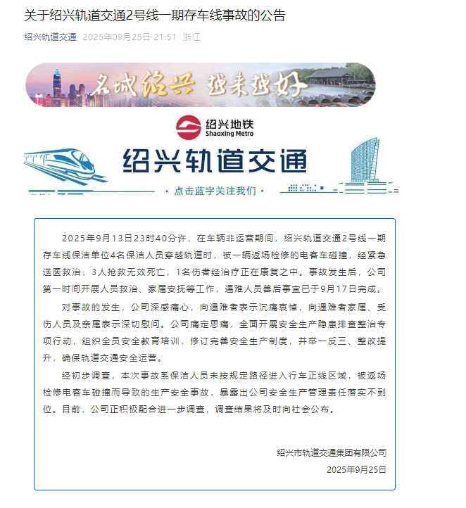 2025年9月13日23时40分许,在车辆非运营期间,绍兴轨道交通2号线一期存车线保洁单位4名保洁人员穿越轨道时,被一辆返场检修的电客车碰撞,经紧急送医救治,3人抢救无效死亡,1名伤者经治疗正在康复之中。事故发生后,公司第一时间开展人员救治、家属安抚等工作,遇难人员善后事宜已于9月17日完成。