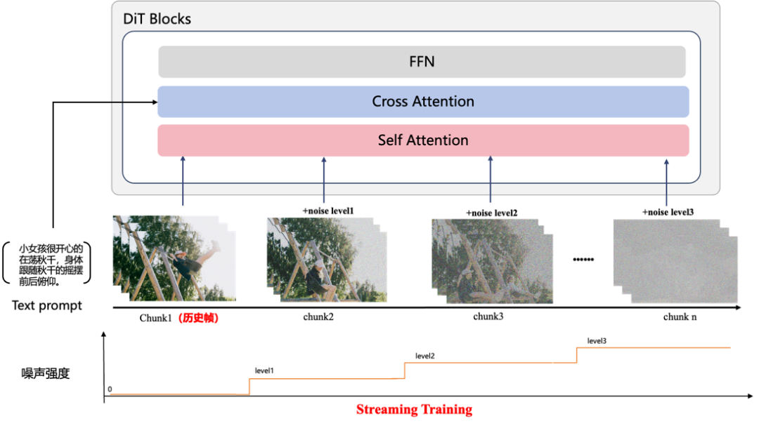 独立噪声:基于时间步采样,为视频扩散模型的每一帧添加不同强度的噪声。根据噪声调度器曲线,每一个预测 chunk 被分配不同的噪声级别(与推理期间使用的噪声调度保持一致)