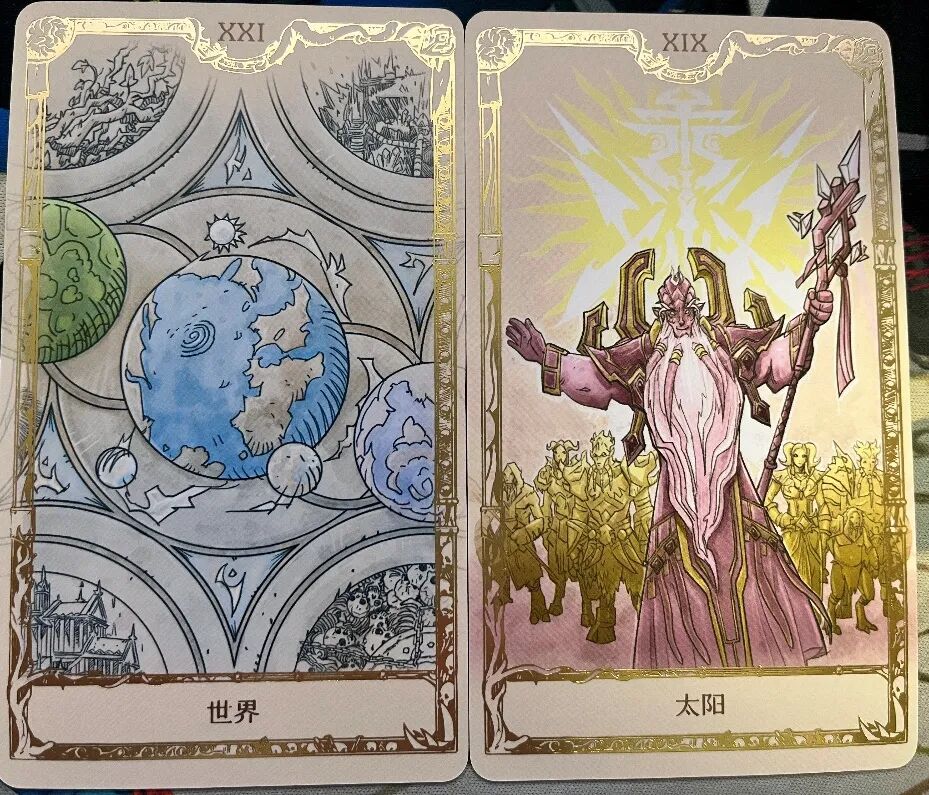 这套塔罗牌的做工和绘画都很精致。每张牌都以烫金装饰,牌张的UV材质也相当硬挺。牌张插画的作者是法国漫画家约瑟夫·拉克鲁瓦,他曾为3卷《魔兽世界编年史》创作过大量地图,那张流传很广的魔兽宇宙设定图就是他的杰作。