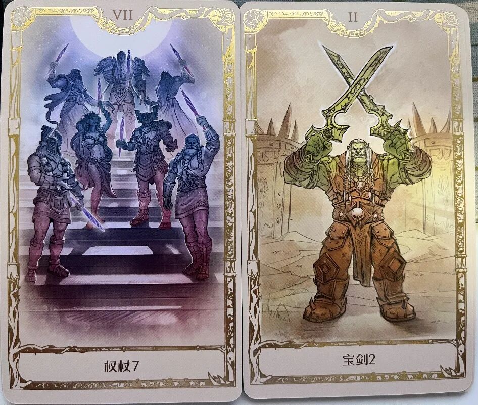 还有些牌张的配图会让老玩家会心一笑。权杖7展示了泰坦们创建的万神殿,其实现在万神殿的成员只有6位——在这张权杖7上,后来堕落的泰坦萨格拉斯还屹立在万神殿中;而宝剑2上,传奇兽人战士萨鲁法尔手握一向被玩家们称为“瓦王剑”的萨拉迈恩,它是两任暴风城国王的佩剑,堪称联盟的家传宝剑,但一生为部落鞠躬尽瘁的萨鲁法尔也是用萨拉迈恩打完了他的最后一战。