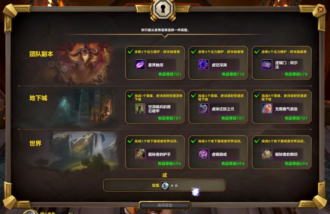 而追求角色成长的玩家,不仅可以再次获得团本的装备,还可以开低保了——只要玩家上周打过足够多的副本,周四就可以在银行的“宏伟宝库”随机获得一件远强于正常掉落的装备。