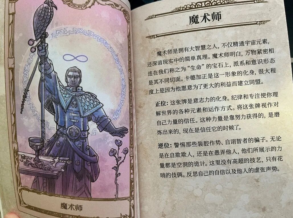 最后一张代表未来的牌则是逆位的魔术师,牌面是玩家的老朋友大法师卡德加。总之这也是上上签,因为卡德加手持的法杖埃提耶什上有一只乌鸦,而乌鸦在我国古代往往是凶兆,那么逆位的乌鸦想必是大大的吉兆。