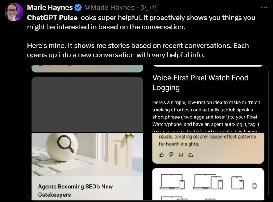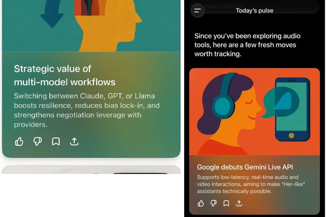 但至少目前为止,它还是专注于提供有用的信息。有人发现这个 Pulse 是真的实诚,一会向你推荐 Claude,一会让你使用 Gemini。