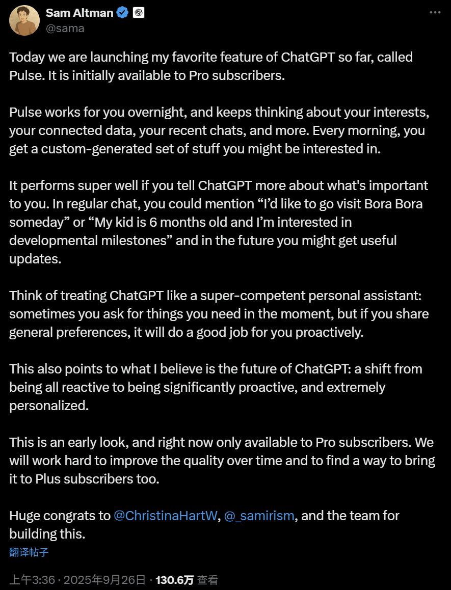 OpenAI 的工程师们表示,ChatGPT 的下一步目标是做「更多有意义的事」,从 Pulse 开始,ChatGPT 会主动帮你实现目标,这个新功能只是个开始。
