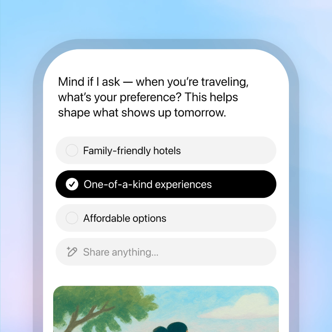 ChatGPT 现在会每天晚上主动进行研究,根据你每天的聊天记录、反馈以及日历等关联应用提供个性化更新。每天清晨,你都会收到一组自定义生成的,可能感兴趣的内容,出现在手机 App 上。