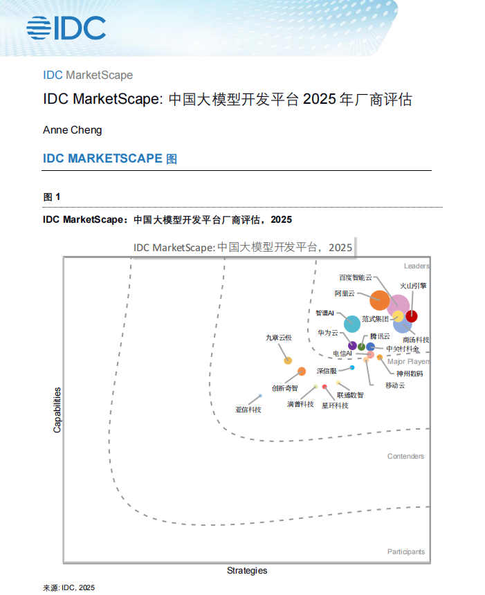 在IDC最新发布的大模型开发平台厂商评估中,中国电信天翼AI凭借其星辰多模态大模型底座和独立双平台战略(大模型开发平台+大模型应用平台),在技术能力、战略布局、创新能力等多维度均表现突出,位于“领导者”象限。